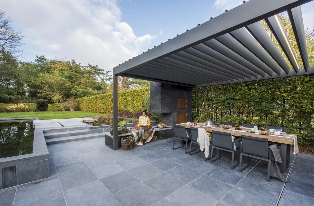 Toto štýlové hliníkové prestrešenie s vodorovnou strechou odolávajúcou vode, vetru a slnku zmení Vašu terasu na príjemný vonkajší priestor. Vďaka jednoduchému ovládaniu a tichému chodu strešných lamiel si v každom okamihu zabezpečíte ideálny pomer osvetlenia a vetrania.